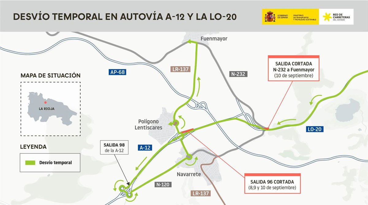 Desde las 8,00 horas del lunes 8 hasta las 13,00 horas del miércoles 10 de septiembre, el corte de la salida en sentido Burgos del enlace de la A-12 con la LR-137 (acceso a Navarrete y al polígono industrial Lentiscares).
