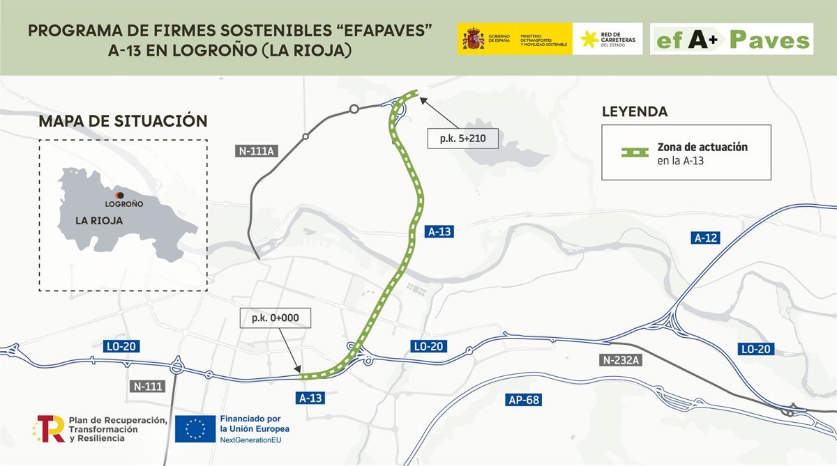El Ministerio de Transportes y Movilidad Sostenible continúa ejecutando las obras de rehabilitación del firme de la A-13 entre los kilómetros 0 y 5,21 en Logroño (La Rioja). Estas obras cuentan con un presupuesto de 2,23 millones de euros (IVA incluido), financiado con cargo a los fondos europeos del Plan de Recuperación, Transformación y Resiliencia (PRTR).