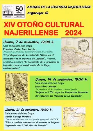 Tres charlas centrarán la decimocuarta edición del Otoño Cultural Najerillense (2024) que se celebrará a lo largo de este mes de noviembre en Nájera. Todas las conferencias son a las 19,30 horas en la sala anexa al Cine Doga, en la calle Constantino Garrán.