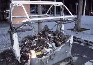 Los tres contenedores -2 verdes y 1 amarillo- se encontraban juntos pero solo ha ardido uno de los verdes que ha quedado calcinado en su totalidad.