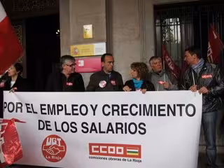 Una alta representación de UGT y CCOO se han concentrado esta mañana frente a la Delegación del Gobierno en La Rioja para exigir una Europa que genere empleo e impulse el crecimiento de los salarios. Precisamente los concentrados portaban una pancarta en la que se podía leer 'Por el empleo y crecimiento de los salarios'.
