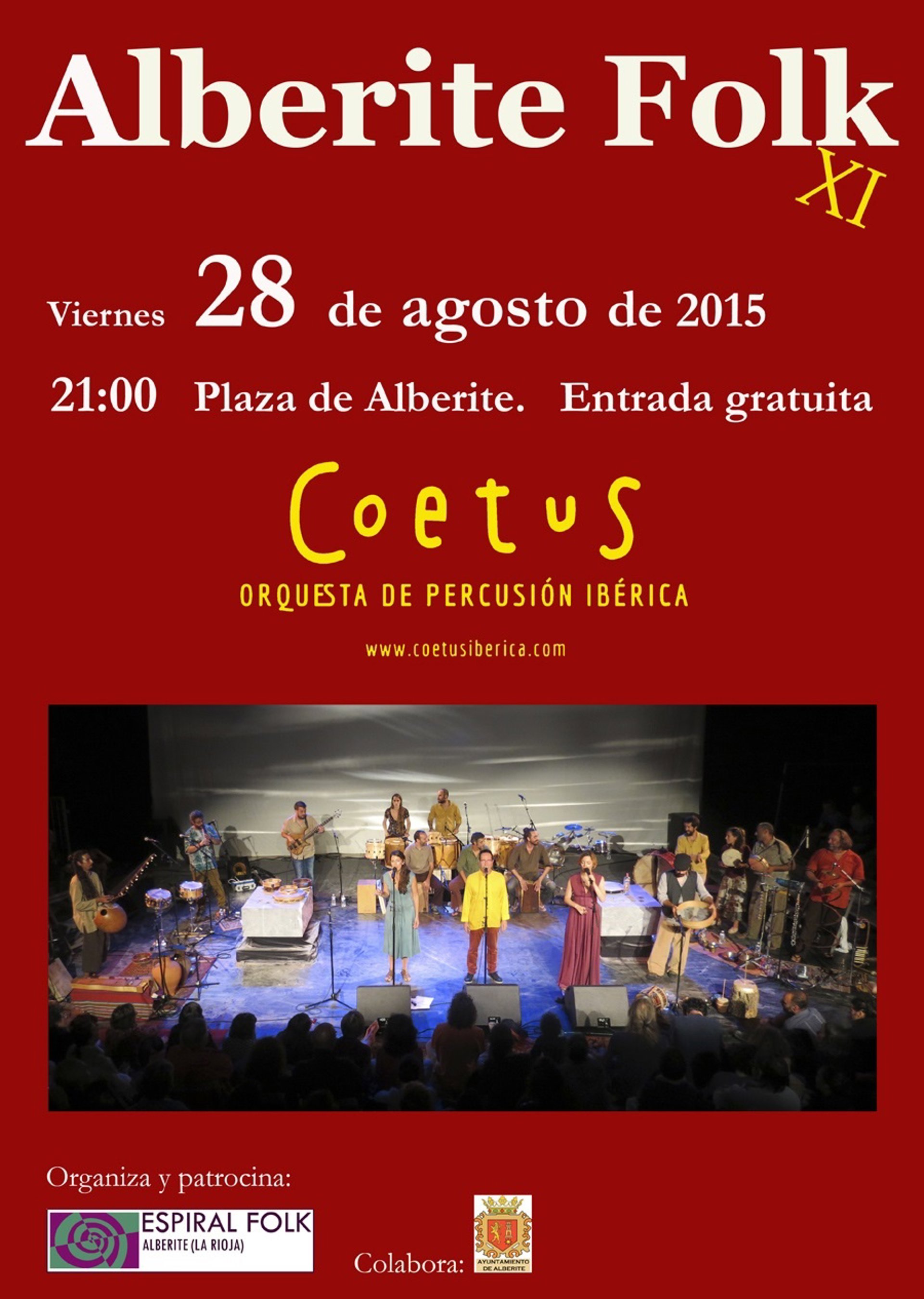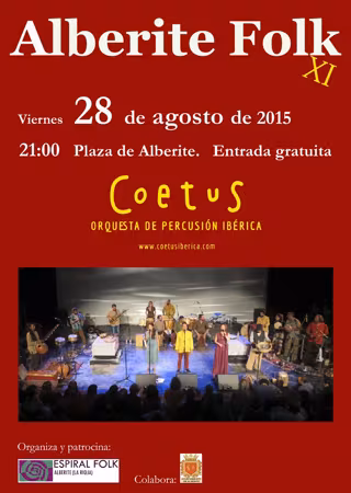La undécima edición del Festival Alberite Folk, organizado por la Asociación Espiral Folk de Alberite, se desarrollará este viernes, 28 de agosto, con el concierto de 'Coetus. Orquesta de Percusión Ibérica', a partir de las 21,00 horas, en la plaza de la localidad.