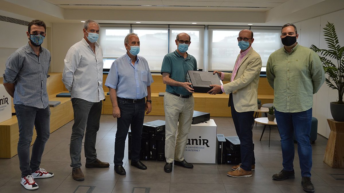 El director de Relaciones Institucionales de UNIR en La Rioja, Alberto Canals, y el coordinador de Administración de sistemas y redes, soporte TIC - PDI de la universidad, Javier Sáenz, han sido los encargados de proporcionar los ordenadores a Miguel Sánchez, director del centro educativo, Guzmán Martín, responsable de empresa escuela, Óscar del Pueyo, director pedagógico del centro, y Cid Peña, tutor DAM, Ciclo Formativo de Grado Superior Desarrollo de Aplicaciones Multiplataforma.