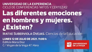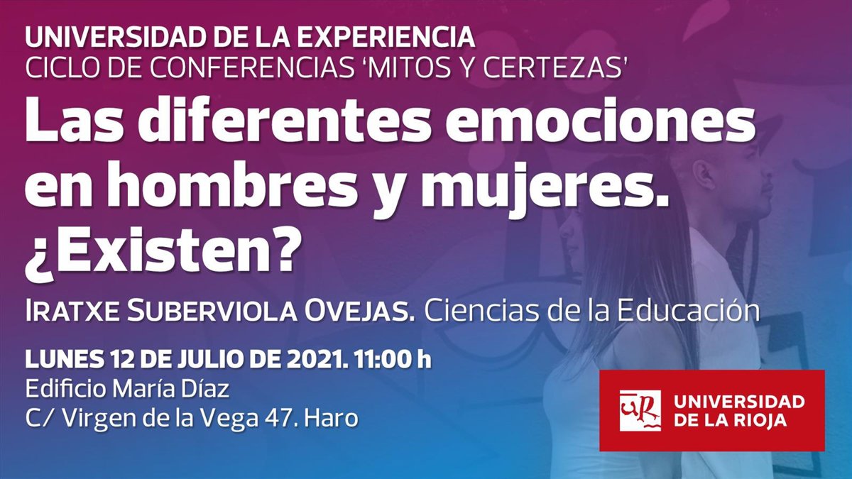 La Universidad de la Experiencia reanudará las actividades presenciales en la ciudad de Haro este lunes, 12 de julio, a las 11,00 horas, en las instalaciones del edificio María Díaz (C/ Virgen de la Vega 47) con el desarrollo de la charla-conferencia 'Las diferentes emociones en hombre y mujeres. ¿Existen?'.