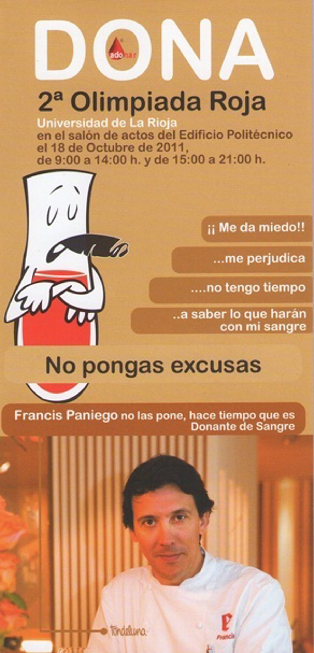 Definida por el coordinador general de Adonar, como una nueva campaña "de sensibilización destinada a la población universitaria: estudiantes, personal administrativo, de servicios y docente", José Antonio Álvarez de Eulate, no puede por menos que recordar que la 1ª Olimpiada Roja, celebrada el 5 de abril de este año, fue "superada con sobresaliente". Esta 2ª edición tiene tres finalidades: "Captar donantes; mostrarles el cariño y respeto que tenemos a los que se incorporan a esta noble causa; y queremos simbolizar que cuando alguien va a donar, le damos lo mejor que está a nuestro alcance, como son las tapas de Francis Paniego".