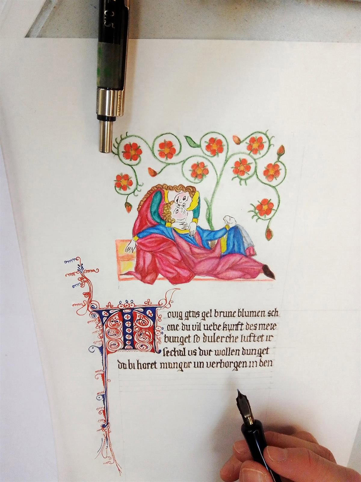 Este martes, 11 de julio, a las 19,30 h en la sede de la Universidad Popular, se inaugura una exposición de los talleres de Caligrafía Artística, que imparte Valle Camacho. Esta muestra recoge trabajos relacionados con el Códex Manesse y la escritura Gótica Quadrata (s. XV), y las Cartas Navales del siglo XVII y la escritura Cancilleresca, los dos temas que han conformado el programa del curso 2022/2023.