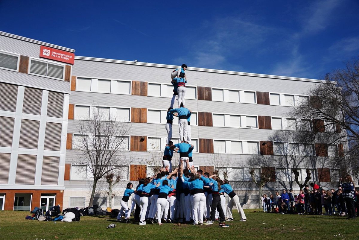 La Universidad de La Rioja ha acogido hoy, sábado 15 de febrero, una exhibición de la Colla Castellera Xoriguers de la Universidad de Girona (UdG), que ha levantado un castell en el jardín del Edificio Vives.