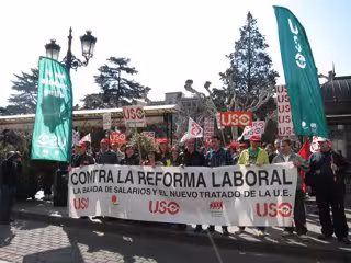 Los concentrados, que portaban una pancarta que decía 'Contra la reforma laboral, la bajada de salarios y el nuevo tratado de la UE', han coreado consignas como "Contra la reforma, huelga general".