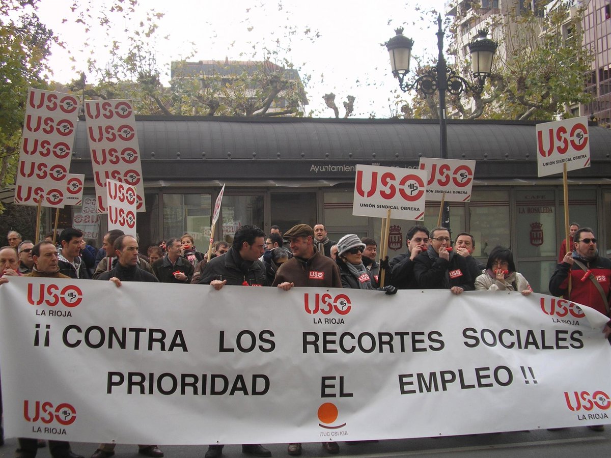 USO La Rioja se ha concentrado frente a la Delegación del Gobierno de La Rioja para reclamar un "cambio radical" en la política económica del Gobierno, empezando por pedirle que "sea autocrítico con la gestión de la crisis que ha realizado y evalúe el coste y la eficacia de las medidas que ha tomado antes de iniciar nuevos ajustes. Una nueva política al servicio del crecimiento y del empleo".