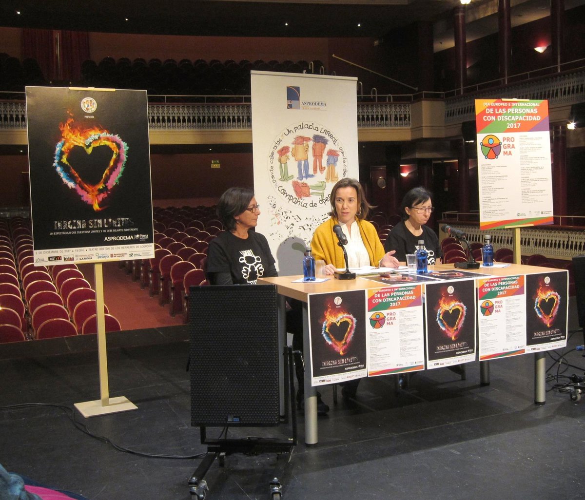 La alcaldesa de Logroño, Cuca Gamarra, acompañada por la directora del centro de día de Asprodema, Yolanda Marín, y por una de las integrantes de la compañía, Esme Carrillo, y ante un público en el que se encontraban buena parte de los actores del montaje, ha presentado el espectáculo, que se podrá ver a las 19 horas, en una función única.