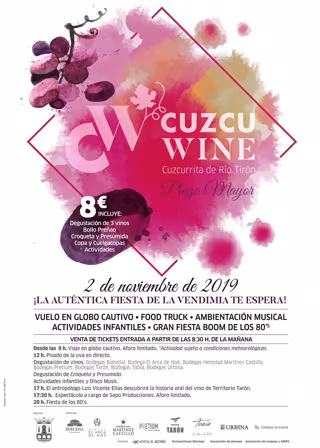 La Plaza Mayor de Cuzcurrita de Río Tirón será el lugar en el que se celebrará un evento organizado por el Ayuntamiento de la localidad y que incluirá degustaciones de vino, food truck, vuelo en globo cautivo, batukada, actividades infantiles, actuaciones teatrales, ambientación musical, pisado de la uva, una gran fiesta boom de los años 80 y muchas más sorpresas.