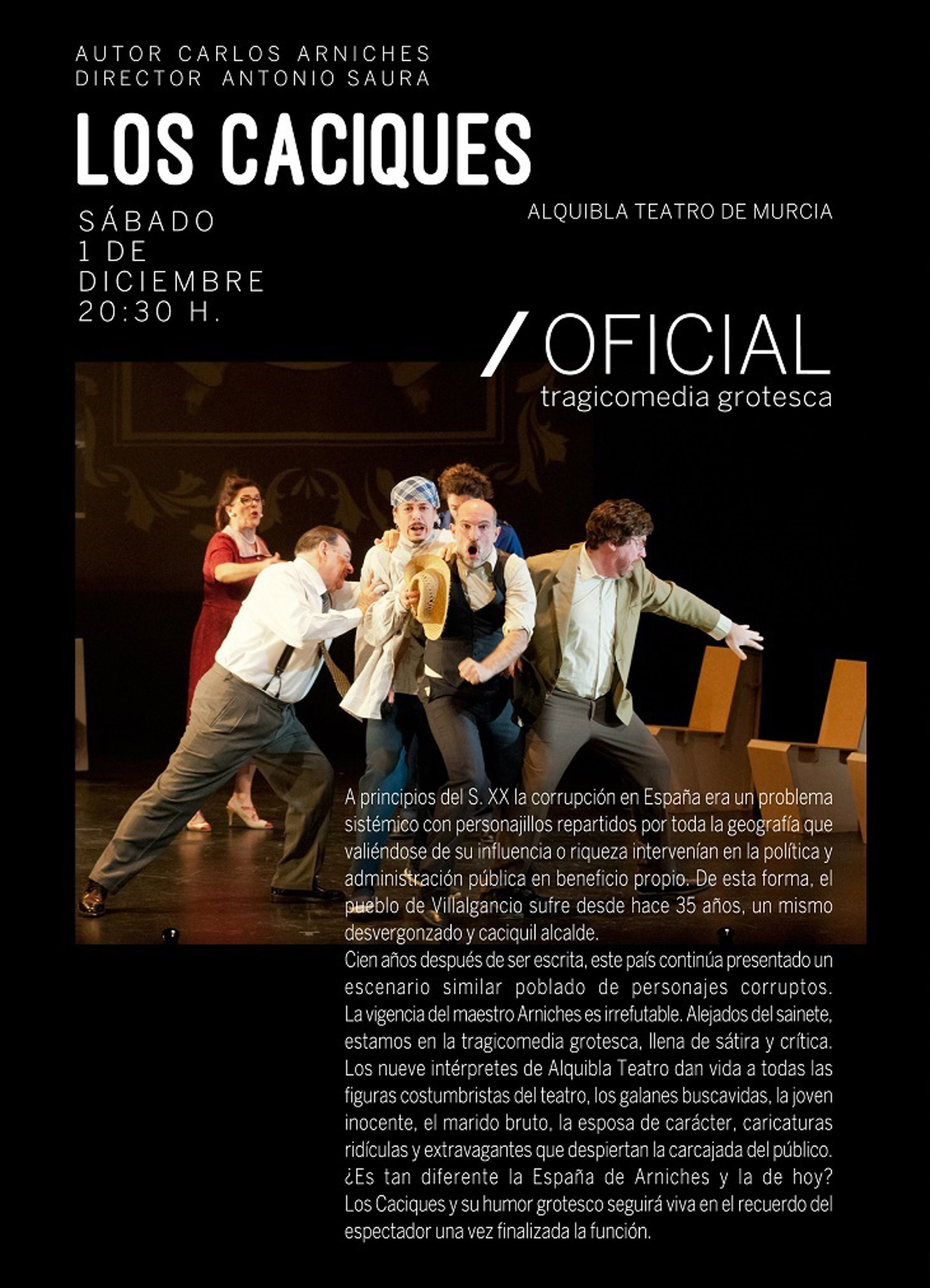 Ya este sábado, uno de diciembre, Alquibla Teatro de Murcia representará "Los Caciques", también a las 20,30 horas. Esta tragedia grotesca de Carlos Arniches estará dirigida por Antonio Saura. Los Caciques y su humor grotesco seguirá viva en el recuerdo del espectador, una vez finalizada la función.