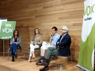 El portavoz del Grupo Parlamentario de Vox, Ángel Alda, interviene en un acto en Logroño junto a la concejala de Logroño, María Jiménez, la candidata 8 a las europeas, Marcela Reigia, y el diputado regional Héctor Alacid - EUROPA PRESS