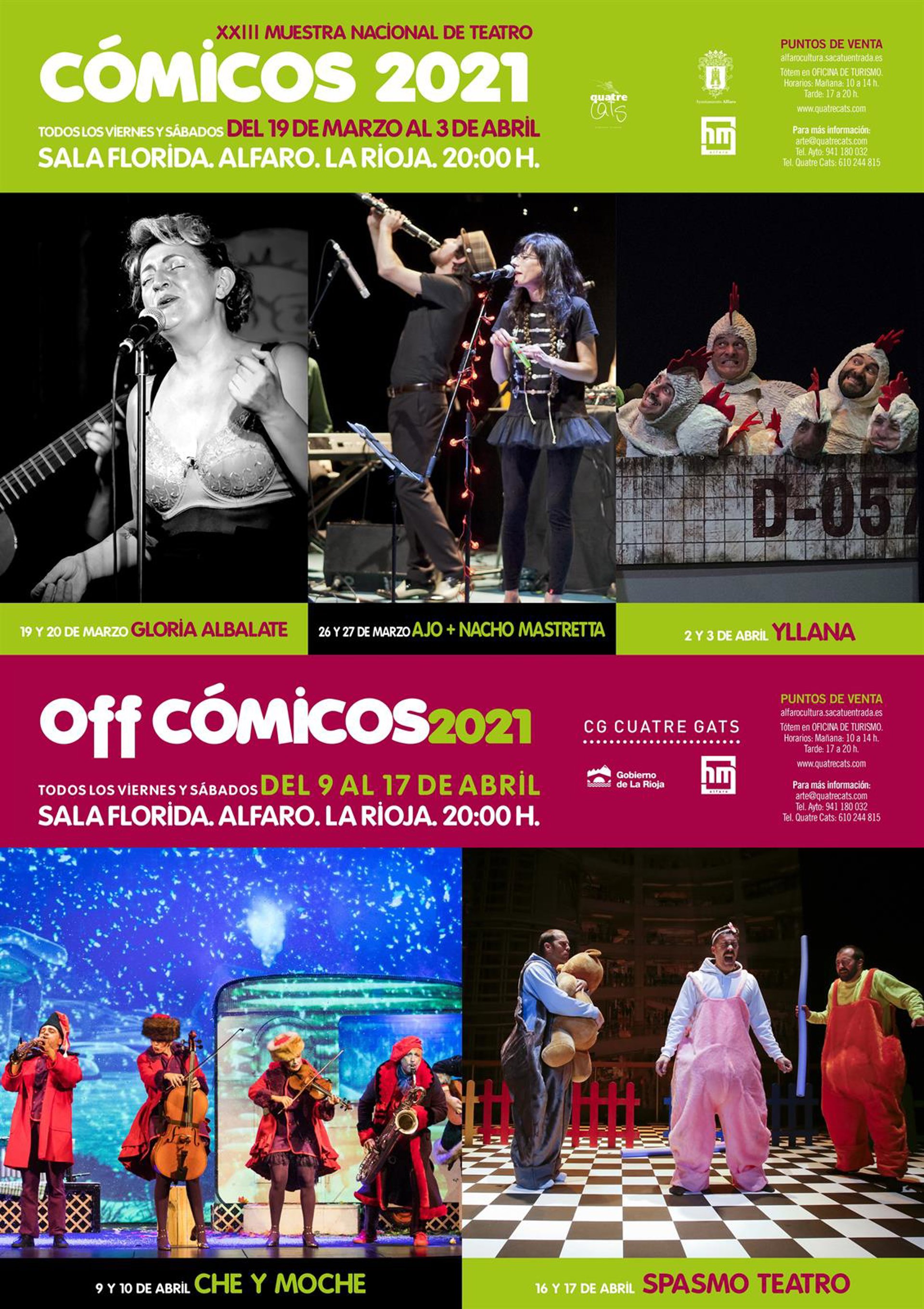 Esta XXIII Edición de Cómicos mantiene el formato habitual de doble función por obra, los viernes y sábados, pero abandonan su horario nocturno y las funciones darán comienzo a las 20,00 horas en la Sala Florida. Con las entradas a la venta a partir del martes día 9 de marzo a las 9 de la mañana en alfarocultura.sacatuentrada.es y en www.quatrecats.com.