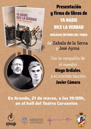 El periodista Vicente Zabala de la Serna presentará en Arnedo su libro 'Ya nadie dice la verdad', diálogos íntimos del toreo, una obra de la editorial 'El Paseíllo' que recoge reflexiones de figuras del toreo de varias épocas y está ilustrada con imágenes del fotógrafo José Aymá. El acto tendrá lugar el próximo viernes 21 de marzo a las 19,00 horas en el Hall del Teatro Cervantes y será conducido por el cronista taurino Javier Cámara. Además del autor del libro, estará presente en el mismo el matador de toros Diego Urdiales.