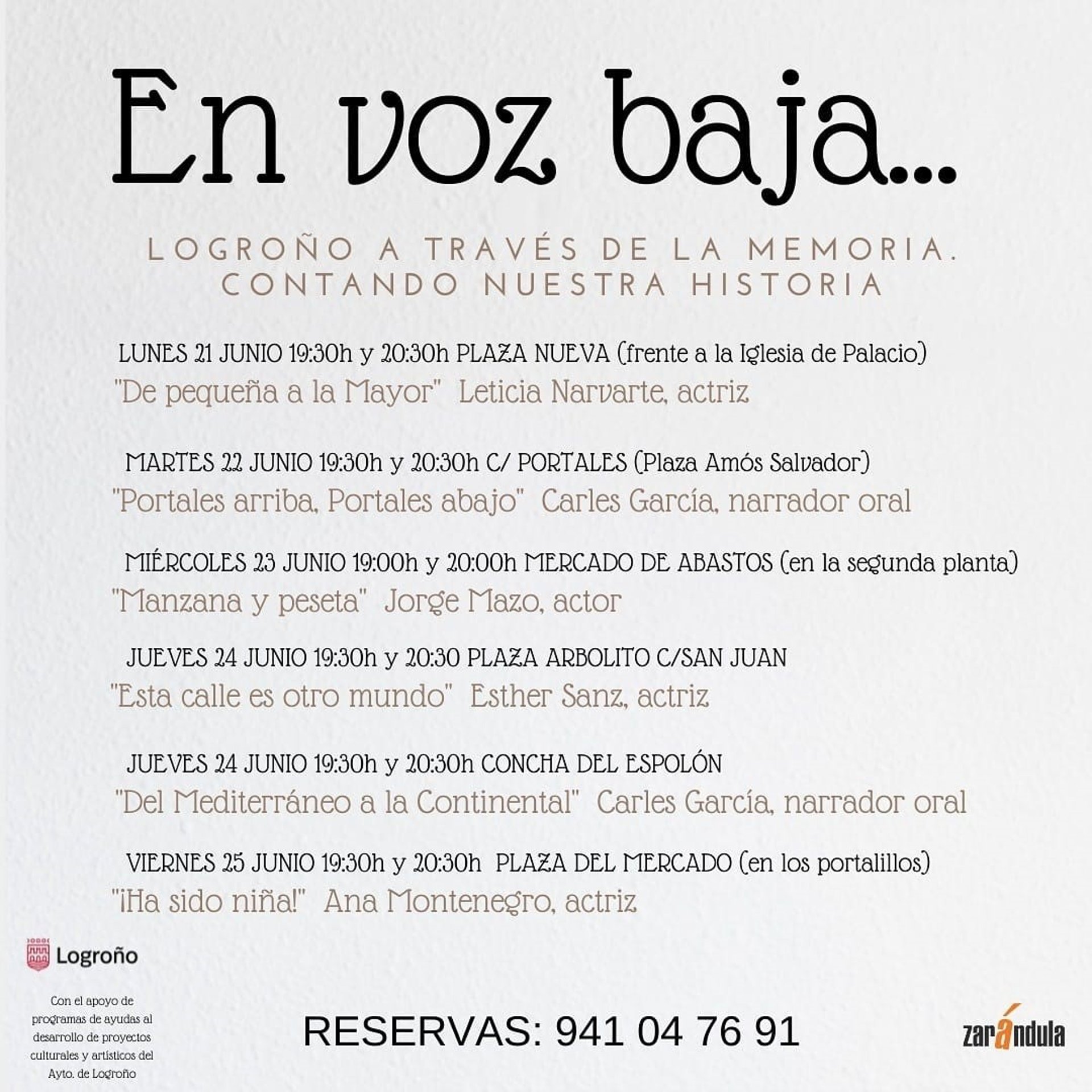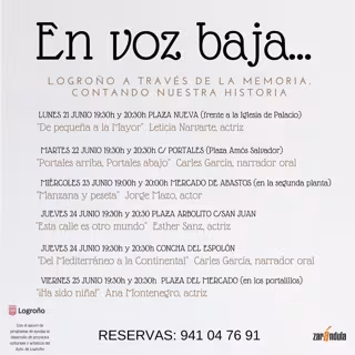 Zarándula desarrolla esta semana "En voz baja", un proyecto de recuperación de la memoria oral de nuestra ciudad a través de sus habitantes, llevado a cabo por el grupo en el ámbito del programa de ayudas al desarrollo de proyectos culturales y artísticos del Ayuntamiento de Logroño.