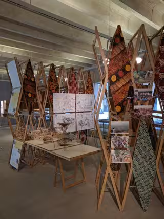 El montaje de la exposición ha sido diseñado por el arquitecto y Alumni del CEU Guillermo Sánchez Sotés, con una propuesta de muy bajo coste que reutiliza borriquetas existentes y telas africanas creando "muros" expositivos.