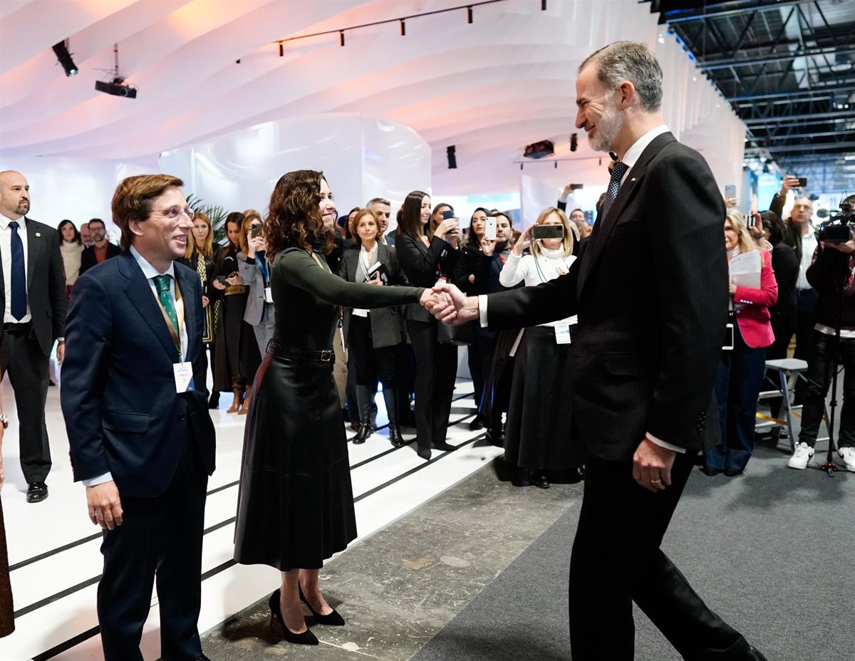 La presidenta de la Comunidad de Madrid, Isabel Díaz Ayuso, ha acompañado este miércoles a Sus Majestades los Reyes durante la inauguración de la Feria Internacional de Turismo Fitur 2023, que se prolongará hasta este domingo y donde la región promocionará sus principales atractivos turísticos, como la riqueza cultural, y el estilo de vida que la caracteriza "para seguir atrayendo turismo de calidad".