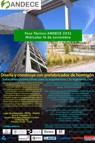 Además, se celebrará una mesa redonda, moderada por Alejandro López, Director Técnico de ANDECE, en la que participarán el profesor de ICITECH (Instituto de Ciencia y Tecnología del Hormigón) de la Universidad Politécnica de Valencia José Adam, el socio director de Gaudim Ingenieros Fernando Rodríguez, y el director técnico y responsable de Innovación de IECA (Instituto Español del Cemento y sus Aplicaciones) César Bartolomé.