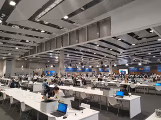 Abierto 24 horas, dispone de una sala central con puestos de trabajo, alberga hasta 13 salas para ruedas de prensa, una de ellas la central con capacidad para 350 personas. En ellas será en las que comparezcan todos los presidentes y primeros ministros el jueves, una vez finalice la Cumbre, para dar cuenta de los logros cosechados.