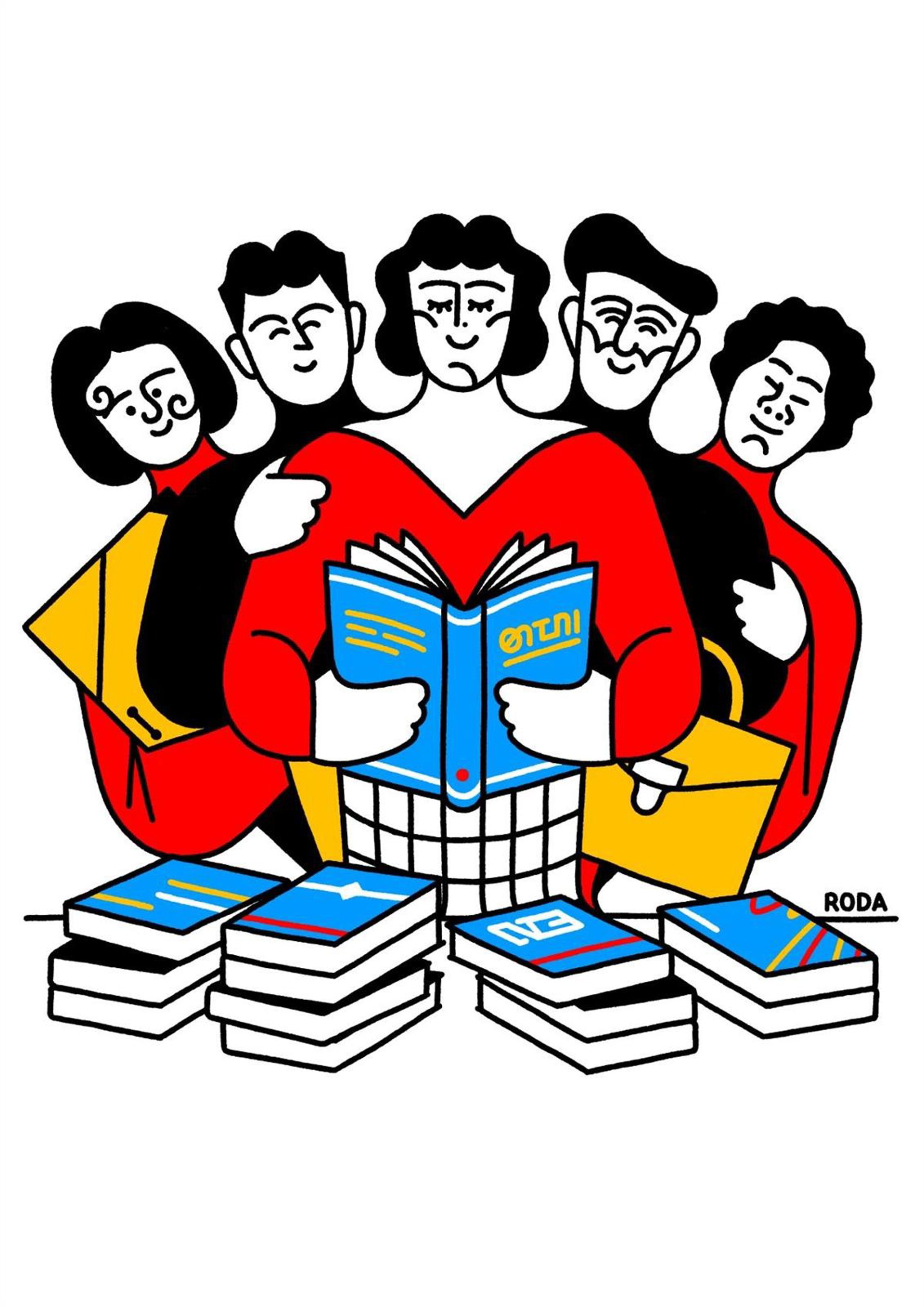 En su trabajo, Roda, siempre busca ilustrar con pocos elementos, para así potenciar la expresividad de estos. En este caso, el elemento central es el libro alrededor de él se sitúan un grupo de personas de diferentes edades y perfiles con el que pretende transmitir la alegría de leer. "Cómo un libro te acompaña y sostiene sin importar la edad, la profesión o el contexto", ha argumentado el autor.