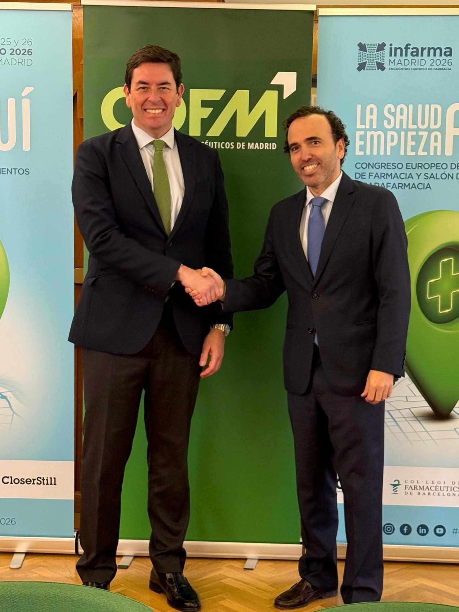 Manuel Martínez del Peral, presidente del COFM y de Infarma Madrid 2026; Jordi Casas, presidente del COFB y vicepresidente de Infarma Madrid 2026 - COFM