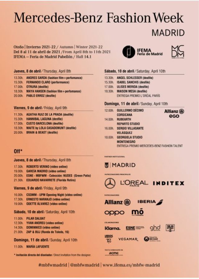 Roberto Verino, García Madrid, Eduardo Navarrete, Ernesto Naranjo, Yvan Andreu, Pilar Dalbat, Dominnico, Zap&Buj, Odette Álvarez y María Lafuente, conforman el programa off de MBFWMadrid. Además, también participan ESNE con su desfile de la colección Green Patio y el Centro Superior de Diseño de Moda Madrid (CSDMM).