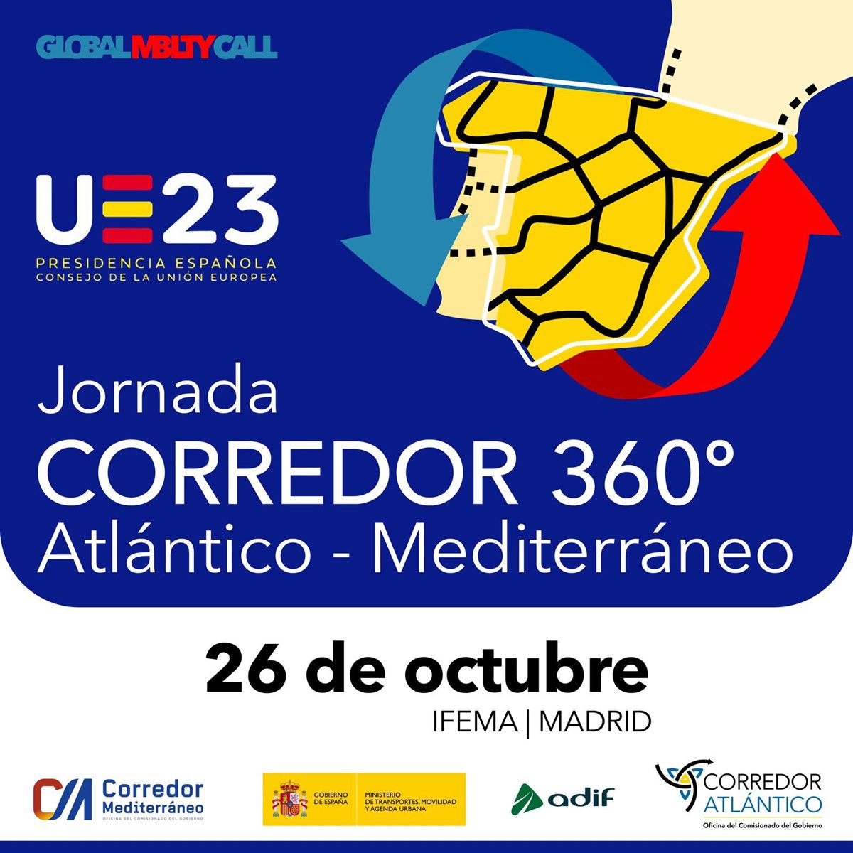 'Corredor 360: Atlántico y Mediterráneo es el tercer evento en Global Mobility Call de la agenda de la Presidencia Española del Consejo de la Unión Europea, junto con el evento del día 25 de octubre en el EU Forum Rural Mobility Conference, y la reunión el jueves 26 de octubre The PEP Partnership on Active Mobility.
