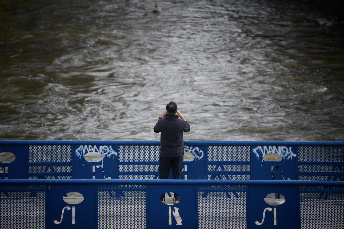 Una persona fotografía la crecida del río, en el parque lineal del Manzanares, a 20 de marzo de 2025, en Madrid (España). - Fernando Sánchez - Europa Press