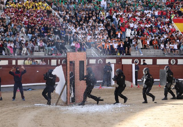 La Policía Nacional ha reunido este martes a 17.500 escolares llegados a pie, en Metro o en autobuses con sus profesores de 163 colegios de Madrid en una exhibición de sus unidades especiales en la Plaza de Las Ventas de Madrid.