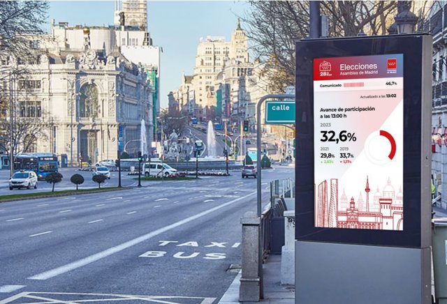 Un total de 450 puntos digitales multimedia a través de marquesinas del transporte público de once municipios y una pantalla led de 36 metros cuadrados en la fachada principal de la Real Casa de Correos en la Puerta del Sol, sede de la Presidencia del Gobierno regional, informarán a la ciudadanía en tiempo real de los datos de participación y el recuento de votos de las elecciones del 28-M.