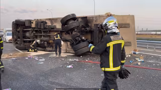 El impacto ha dejado a uno de los vehículos volcado en medio de la carretera y al otro en el arcén. Los Bomberos de la Comunidad de Madrid han tenido que asistir al conductor de este último, que había quedado atrapado en la cabina.