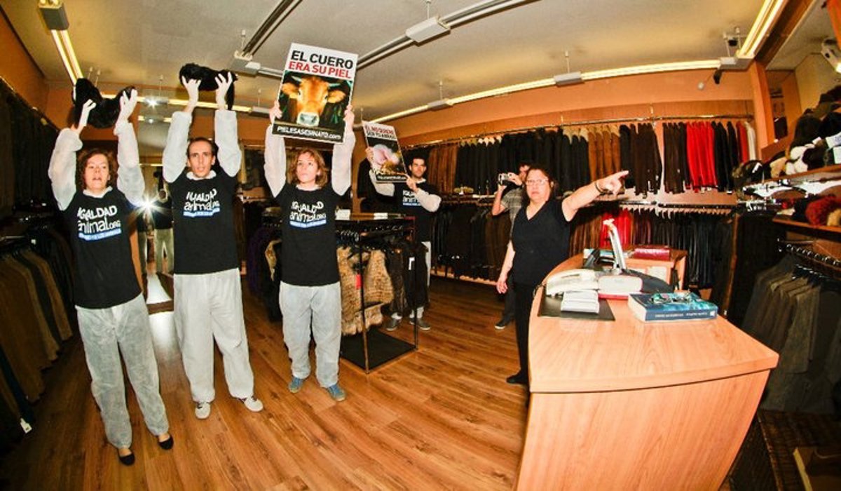 Cinco activistas de Igualdad Animal han irrumpido a las 12 horas en una de las peleterías que la empresa Jacinto Rodríguez posee, situada en el centro de Madrid, con los cadáveres de dos visones reales provenientes de granjas peleteras españolas, además de diversos carteles reivindicativos, según ha informado Igualdad Animal en un comunicado.