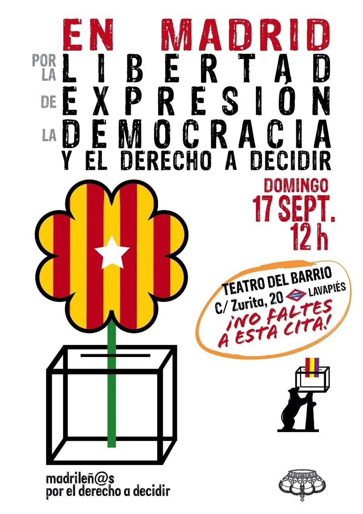 El acto en apoyo al referéndum por la autodeterminación de Cataluña organizado por 'Madrileños por el Derecho a Decidir' se celebrará finalmente este mediodía en el Teatro del Barrio, en la calle Zurita del madrileño barrio de Lavapiés.