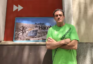 El actor César Vea permanece en huelga de hambre desde hace nueve días frente a la sede nacional del PSOE, en la calle Ferraz, para evitar el desahucio de su familia por deudas contraídas a raíz del cambio de la legislación sobre energías renovables de 2011, que afectó a una placa fotovoltaica que instaló en 2008 en Villar de Arnedo, La Rioja.