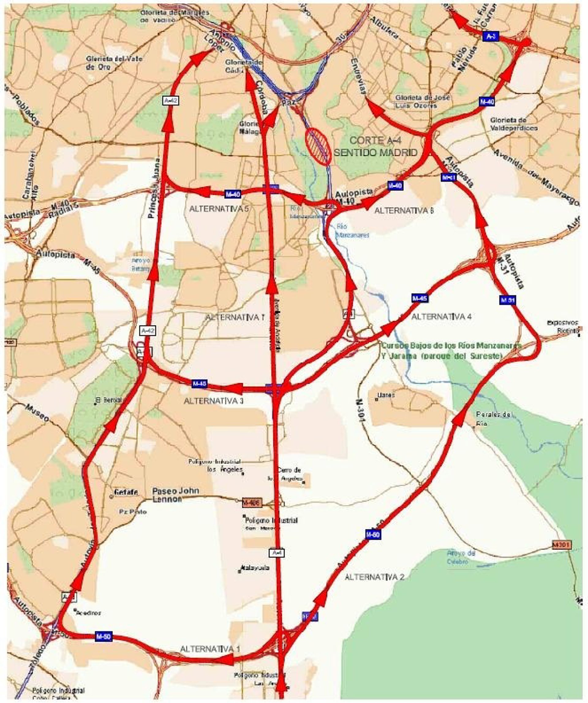 Durante este tiempo, el tráfico se desviará por la M-50, la M-45, la M-40 así como por la avenida de Andalucía, todos sentido A-42 (Carretera de Toledo) de acuerdo con los itinerarios trazados al respecto.