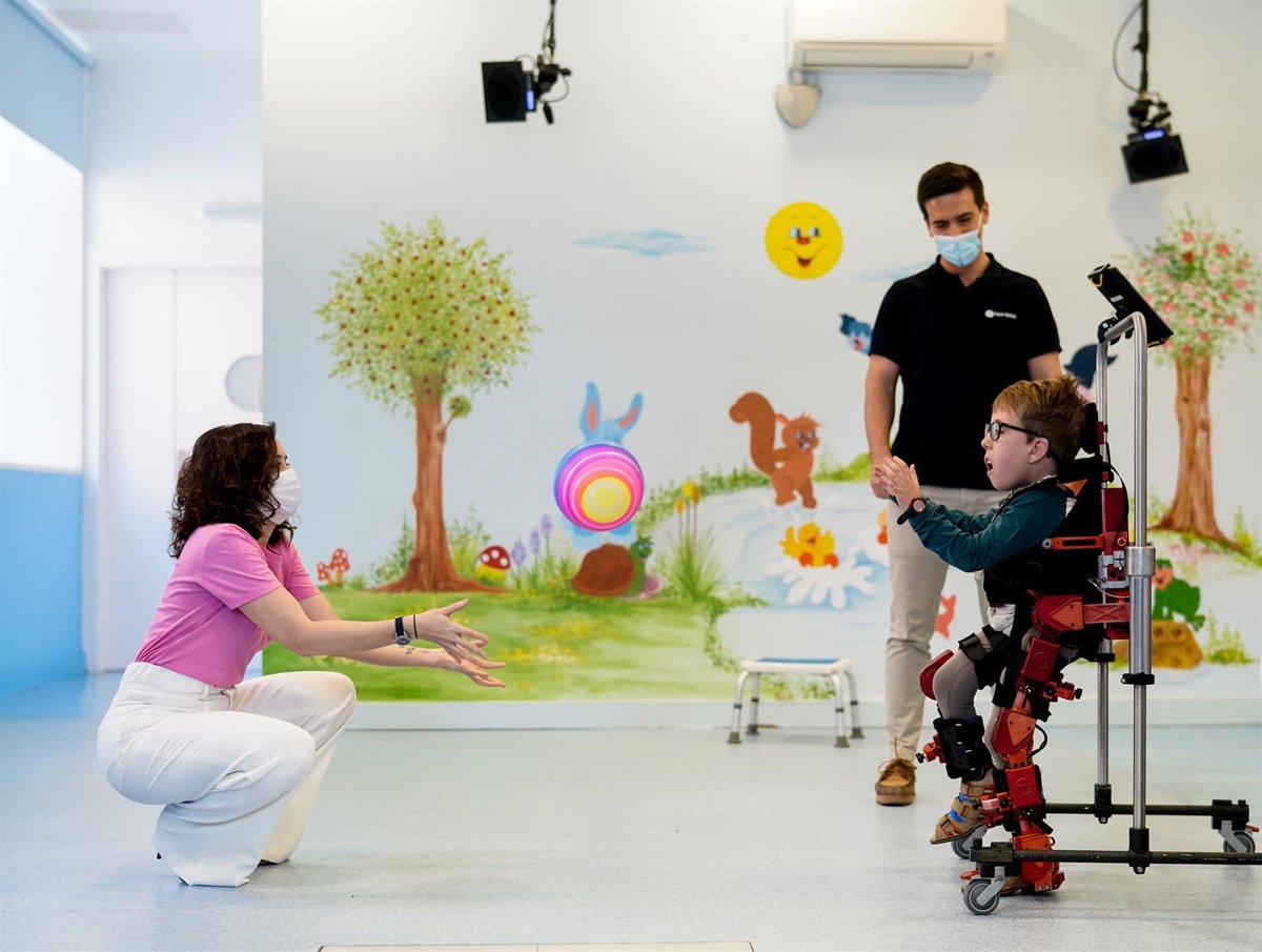 Adolfo, un niño de nueve años afectado por una miopatía congénita que le impide andar, está recuperando poco a poco su movilidad gracias el uso pionero de exoesqueletos biónicos diseñados para la rehabilitación de menores en hospitales públicos de la Comunidad de Madrid.