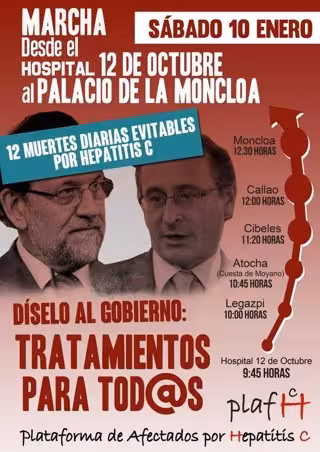 La Plataforma de Afectados por la Hepatitis C (PLAFH) celebra este sábado en Madrid una marcha hasta el Palacio de la Moncloa para exigir al presidente del Gobierno, Mariano Rajoy, que todos los pacientes afectados por el virus sean tratados con los fármacos de última generación que se están autorizando.