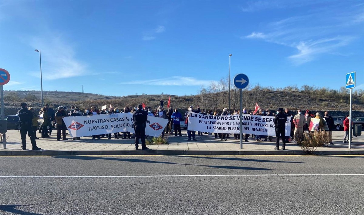 Ciudadanos afectados por la Línea 7B de Metro de Madrid y otros al grito de Sanidad Pública reciben con abucheos a la presidenta de la Comunidad, Isabel Díaz Ayuso, en el Hospital del Henares, en Coslada.
