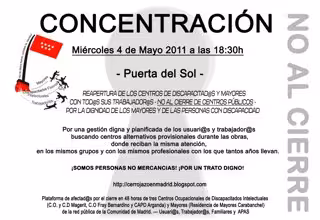 La Plataforma de Afectados por el cierre en 48 horas de tres centros ocupacionales de discapacitados (Magerit, Fray Bernardino y Centro de Atención a Discapacitados de Arganda del Rey) volverán a concentrarse en la Puerta del Sol este miércoles para continuar su protesta contra la decisión de la Comunidad de Madrid de cerrar estos centros.