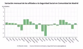 Los afiliados a la Seguridad Social en la Comunidad de Madrid crecieron un 0,36% en febrero con una media de 11.476 cotizantes más en relación al mes anterior, según datos del Ministerio de Inclusión, Seguridad Social y Migraciones publicados este martes.