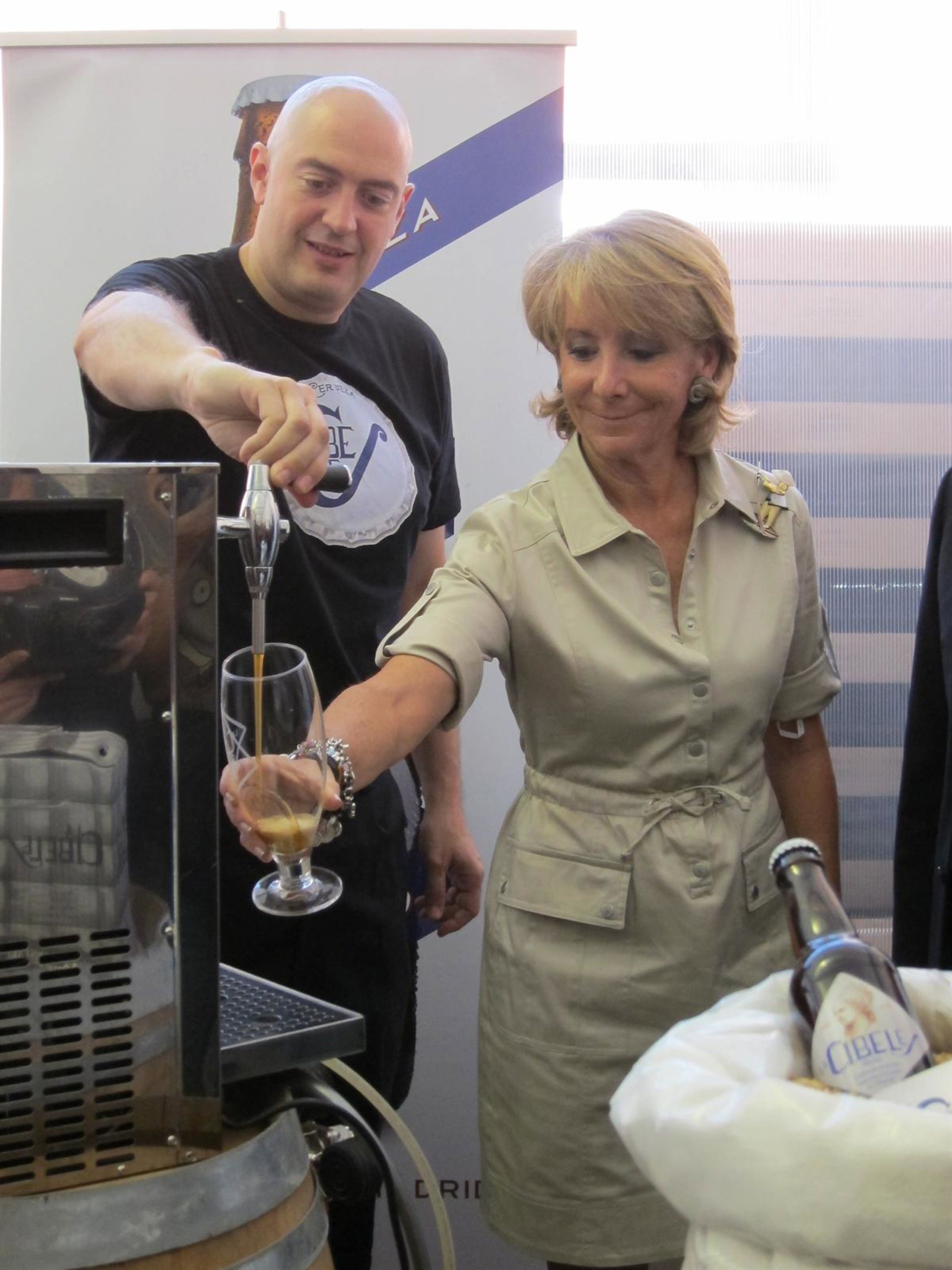 Acompañada del consejero de Economía, Percival Manglano, y del alcalde de Alcorcón, David Pérez, la primera parada del día ha sido en la cervecera La Cibeles, la primera cerveza artesanal de Madrid, elaborada con productos naturales de la región y con agua del Canal de Isabel II, "la mejor del mundo", según ha dicho Aguirre.