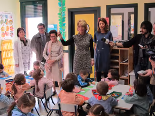 Este colegio es uno de los que cuenta con enseñanza bilingüe en la región y la presidenta se ha valido de este rasgo característico en su visita a los alumnos del centro. En el aula de 3 años ha aprovechado para 'examinar' a los niños y preguntarles cómo se dicen algunos colores en inglés.