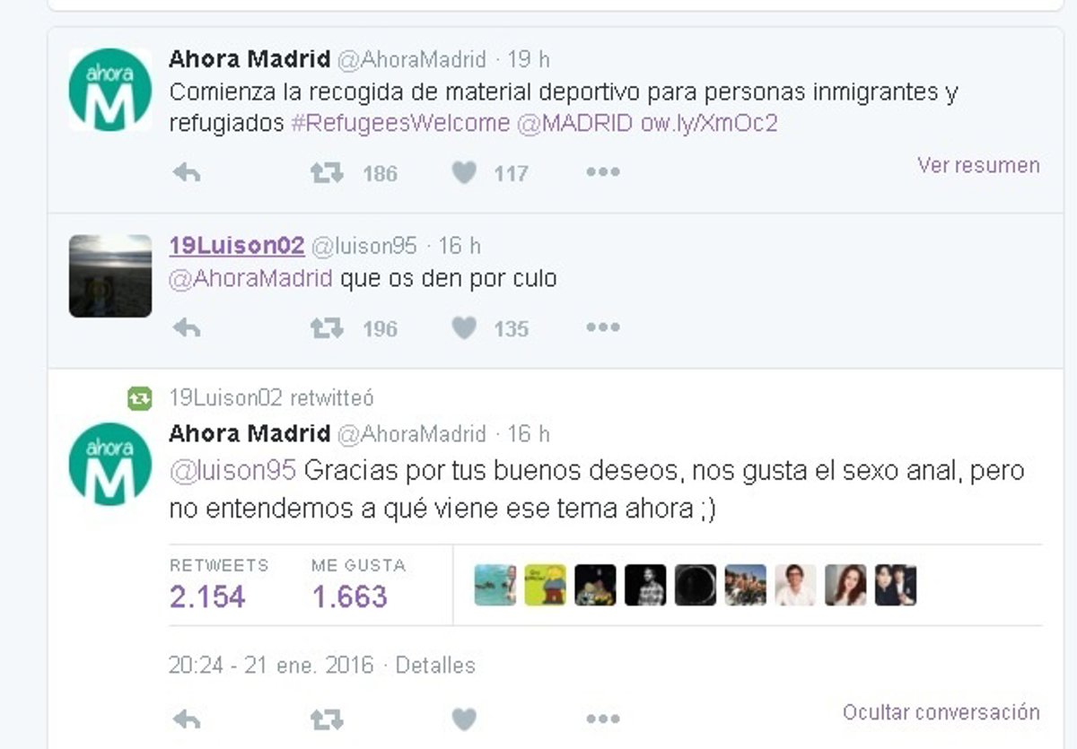 A este comentario un usuario con la cuenta @luison95 respondió a la publicación dirigida a Ahora Madrid con el comentario "que os den por culo". A lo que la formación a su vez replicó con la siguiente frase: "Gracias por tus buenos deseos, nos gusta el sexo anal, pero no entendemos a qué viene ese tema ahora", añadiendo los símbolos de un emoticono guiñando un ojo.