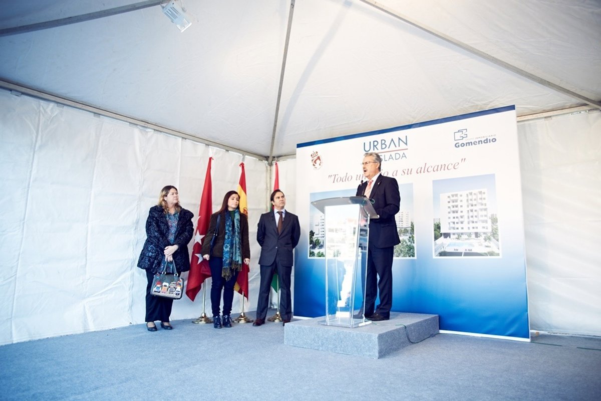 Pablo Gomendio, director general del Grupo Inmobiliario Gomendio, ha aprovechado el acto para señalar que "hoy estamos poniendo la primera piedra de lo que van a ser 150 viviendas de lujo en el corazón de Coslada".