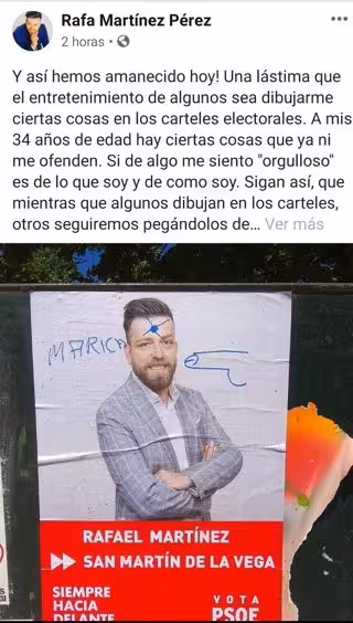 "Y así hemos amanecido hoy. Una lástima que el entretenimiento de algunos sea dibujarme ciertas cosas en los carteles electorales. A mis 34 años de edad hay ciertas cosas que ya ni me ofenden. Si de algo me siento 'orgulloso' es de lo que soy y de cómo soy. Sigan así, que mientras que algunos dibujan en los carteles, otros seguiremos pegándolos de nuevo. Queda demostrado que en ciertos temas nos queda mucho por hacer", ha escrito el propio regidor en su cuenta de Facebook.