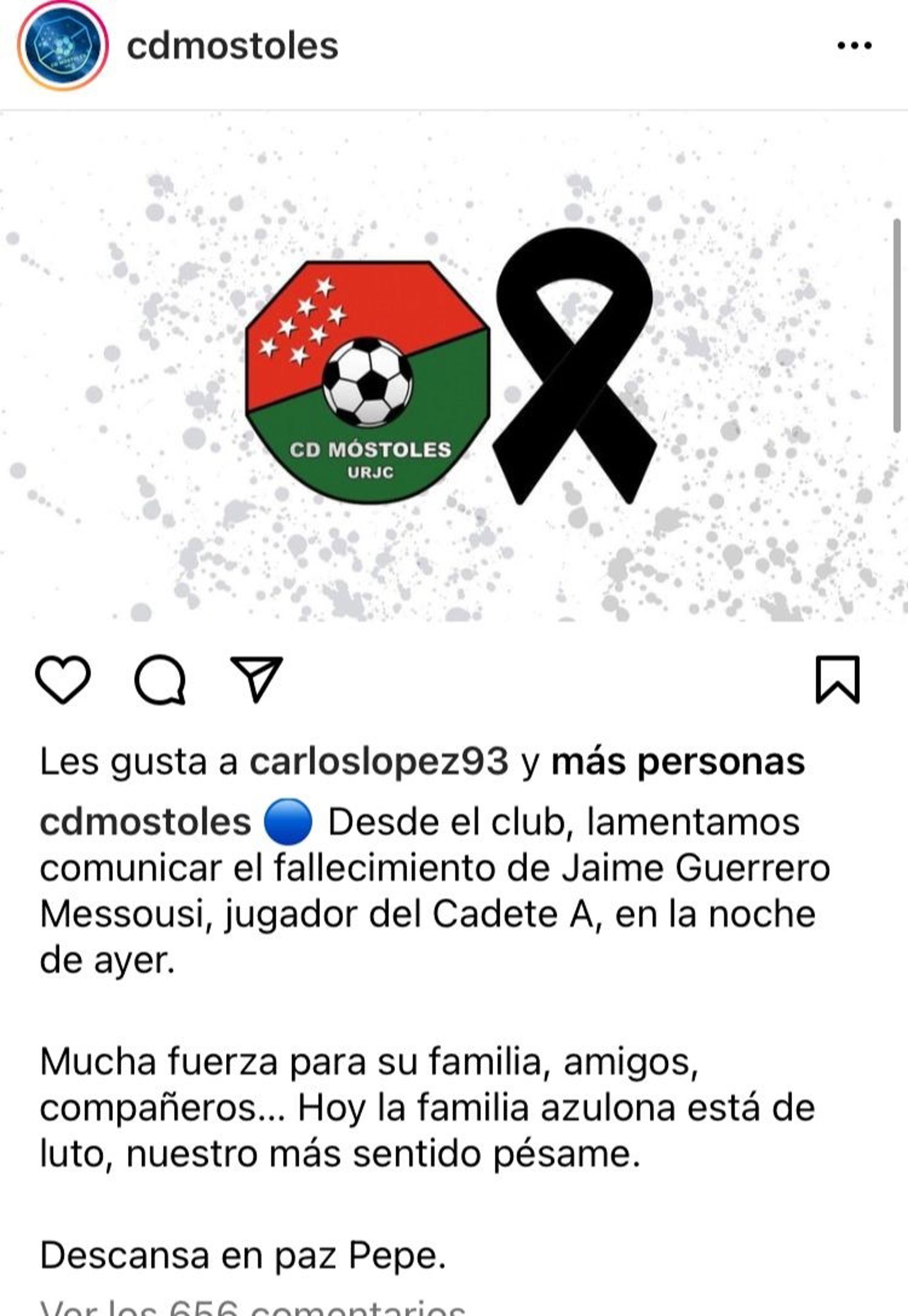 Lo hace tras el mensaje lanzado desde el propio club mostoleño que confirmó que el fallecido era uno de sus jugadores. "Mucha fuerza para su familia, amigos, compañeros... Hoy la familia azulona está de luto, nuestro más sentido pésame. Descansa en paz", expresaron.