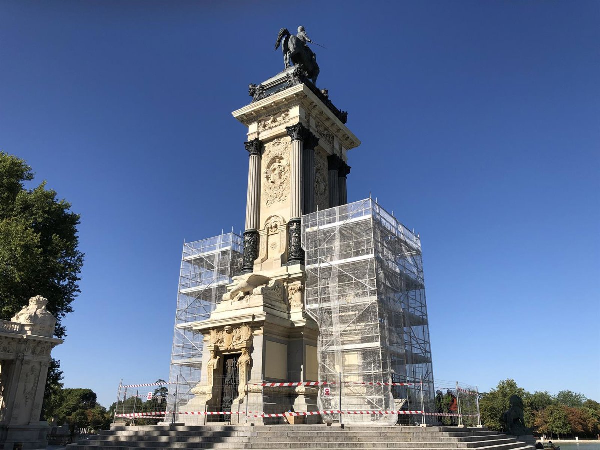 El Consistorio ha comenzado los trabajos de restauración del Monumento a Alfonso XII, que preside el estanque del Parque de El Retiro, coincidiendo con el segundo aniversario de la declaración del Paisaje de la Luz como Patrimonio Mundial.