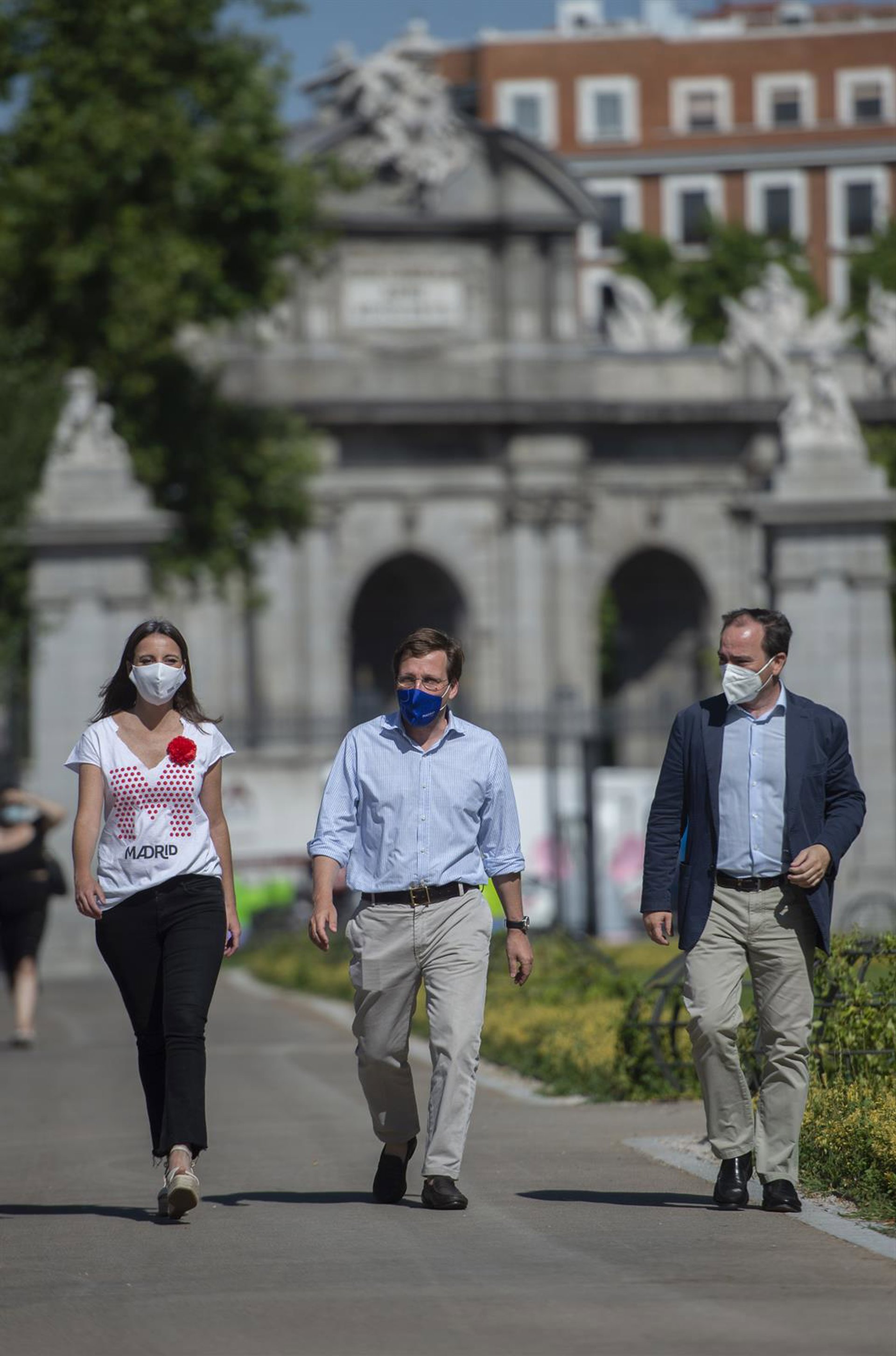(I-D) La delegada del Área de Cultura, Turismo y Deporte, Andrea Levy; el alcalde de Madrid, José Luis Martínez-Almeida; y el delegado de Medio Ambiente y Movilidad, Borja Carabante, conversan a su llegada a los jardines de El Buen Retiro - Alberto Ortega - Europa Press