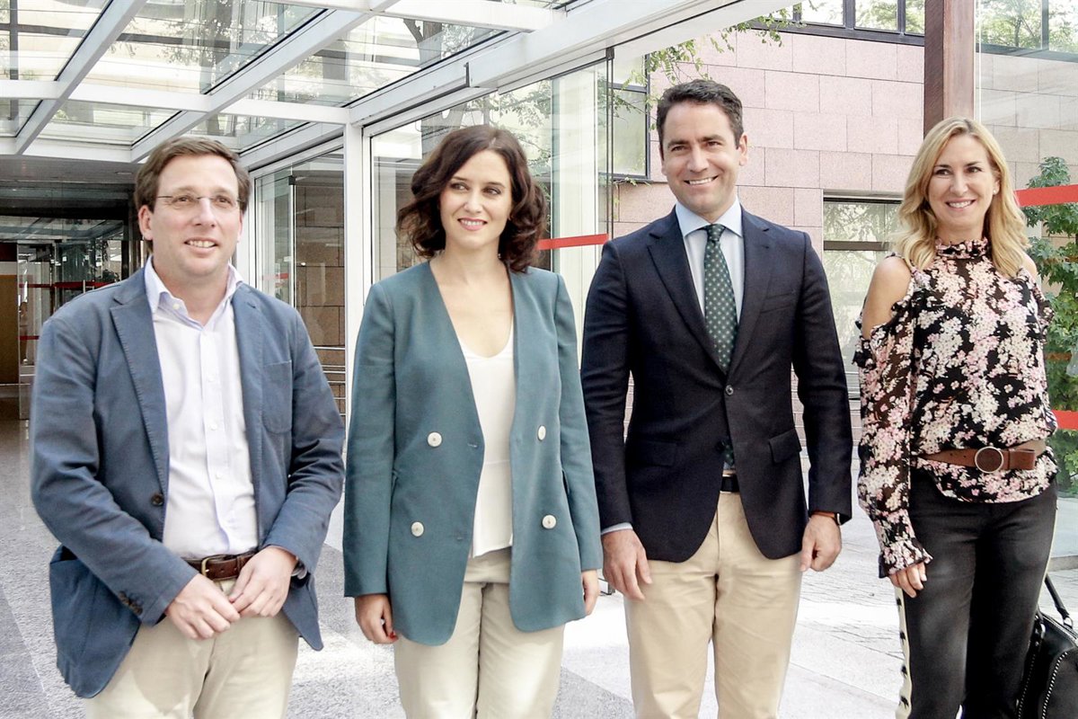 (I-D) El alcalde Madrid, José Luís Martínez-Almeida; la candidata del PP a la Presidencia de la Comunidad de Madrid, Isabel Díaz Ayuso; el secretario general del Partido Popular, Teodoro García Egea; y la presidenta del PPN, en la Asamblea de Madrid. - Ricardo Rubio - Europa Press